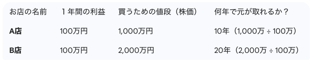 利益が同じなら、PERが低いA店の方が「お買い得」だと分かります。